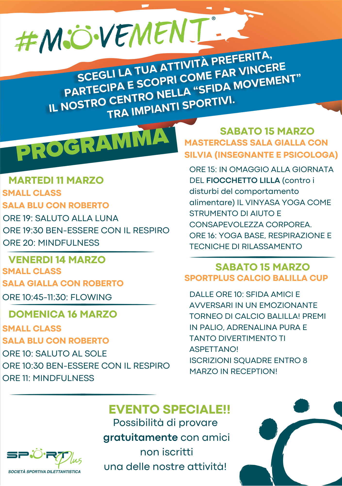 Scegli la tua attività preferita, partecipa (invita anche i tuoi amici), goditi il “movimento” e scopri come far vincere il nostro centro nella “Sfida Movement” tra impianti sportivi.